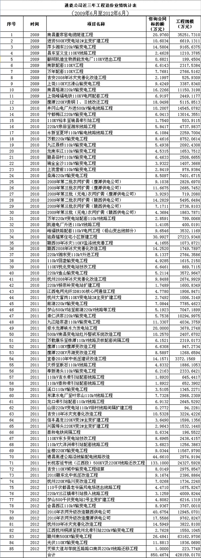 通能公司近三年工程造價(jià)業(yè)績(jī)統(tǒng)計(jì)表