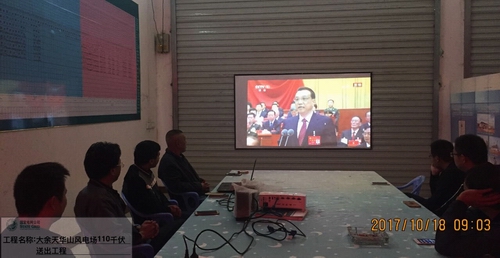 通能公司大余天華山風(fēng)電場110千伏送出工程監(jiān)理項目部員工集中收黨的十九大開幕實況。