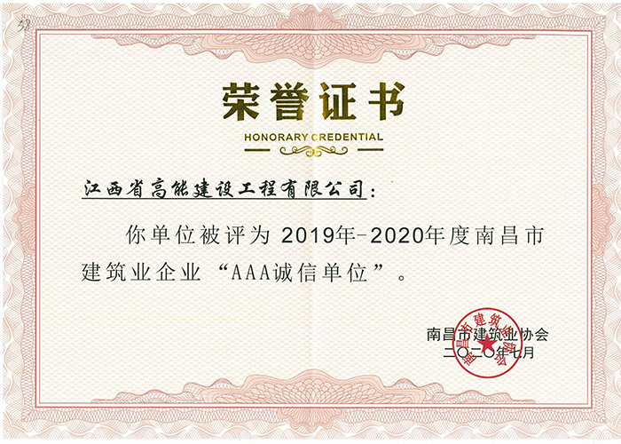 近日,經(jīng)南昌市建筑業(yè)協(xié)會的評審,高能建工獲得2019—2020年南昌市建筑業(yè)企業(yè)“AAA誠信企業(yè)”榮譽稱號。