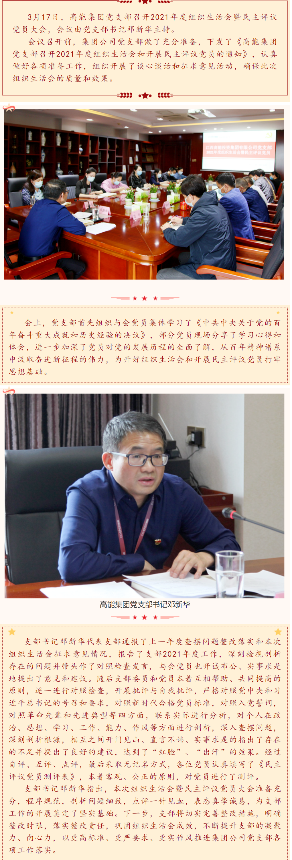 高能集團黨支部召開2021年度組織生活會暨民主評議黨員大會