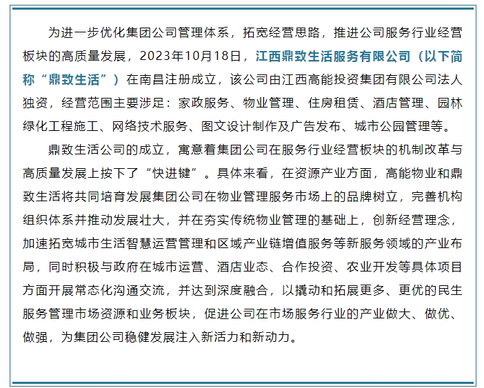 創(chuàng)新經(jīng)營理念 拓寬產(chǎn)業(yè)布局——高能集團在昌注冊成立“江西鼎致生活服務有限公司”