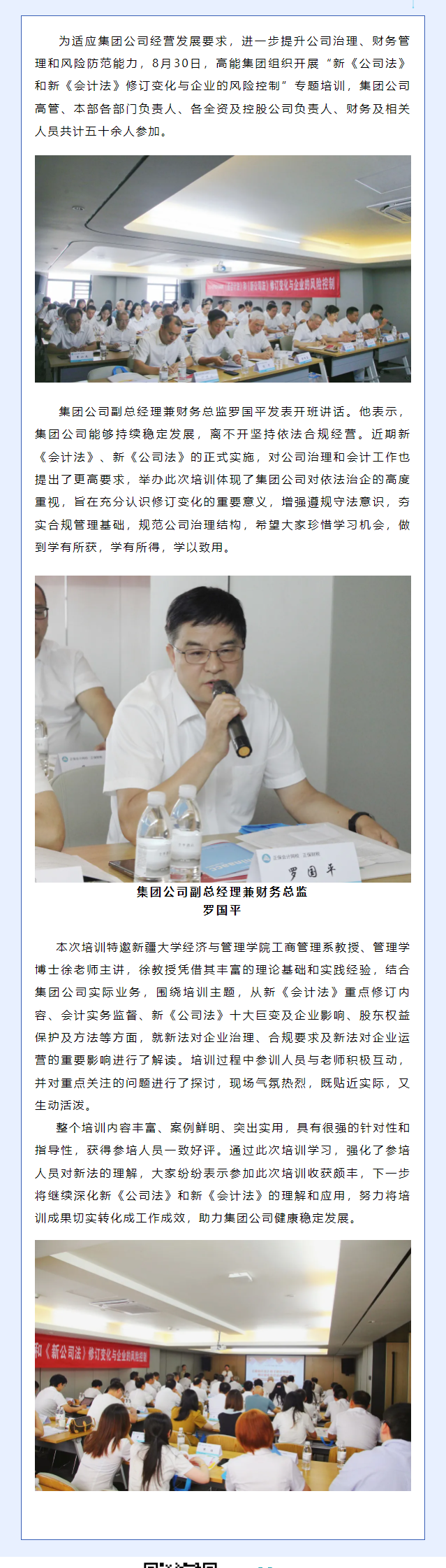高能集團(tuán)開(kāi)展“新《公司法》和新《會(huì)計(jì)法》修訂變化與企業(yè)的風(fēng)險(xiǎn)控制”專題培訓(xùn)
