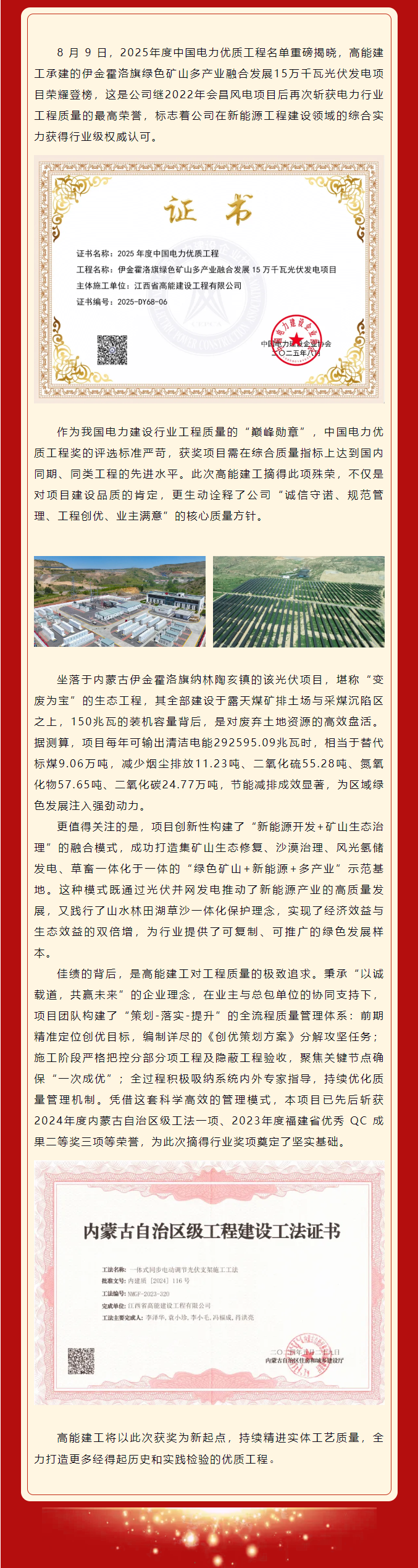里程碑時(shí)刻!高能建工再摘“中國電力優(yōu)質(zhì)工程”獎(jiǎng)